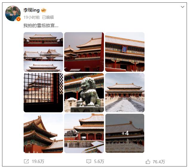 12月14日下午,李现在微博发布了13张故宫雪景图,并配文“我拍的雪后故宫……”